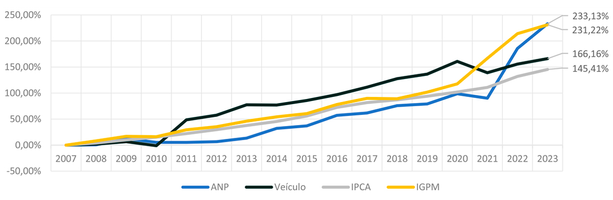Ao realizar análise comparativa entre a inflação acumulada do custo por veículo, com os principais indicadores inflacionários como o valor do diesel, divulgado mensalmente pela Agência Nacional do Petróleo, o IPCA divulgado mensalmente pelo IBGE, e o IGPM divulgado mensalmente pela Fundação Getúlio Vargas, verifica-se que entre os anos de 2010 e 2020, o custo por veículo apresentou variação superior aos principais índices inflacionários, entretanto, a partir de 2020, mesmo com a explosão inflacionária dos principais custos de insumos utilizados nas operações de transporte coletivo por ônibus, o custo por veículo apresentou variação abaixo dos demais índices, apresentando inclusive, retração a partir de 2020.